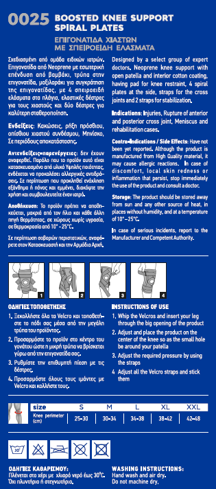 Επιγονατίδα από Neoprene με εσωτερική επένδυση από βαμβάκι, τρύπα στην επιγονατίδα, μαξιλαράκι για συγκράτηση της επιγονατίδας, με 4 σπειροειδή ελάσματα στα πλάγια, ελαστικές δέστρες για τους χιαστούς και δύο δέστρες για καλύτερη σταθεροποίηση.