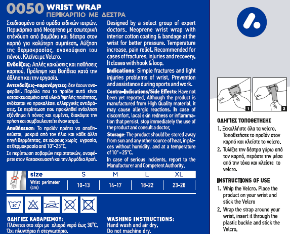 Περικάρπιο από Νeoprene με εσωτερική επένδυση από βαμβάκι και δέστρα στον καρπό για καλύτερη συμπίεση. Αύξηση της θερμοκρασίας, ανακούφιση του πόνου. Κλείνει με Velcro.