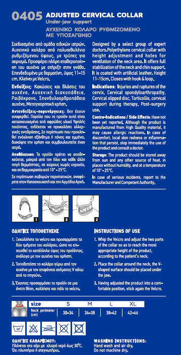 Αυχενικό κολάρο από πολυαιθυλένιο ρυθμιζόμενου ύψους, με τρύπες για αερισμό. Προσφέρει πλήρη σταθεροποίηση του αυχένα με στήριξη στην γνάθο. Επενδεδυμένο με δερματίνη, ύψος 11-15 cm. Κλείνει με Velcro.