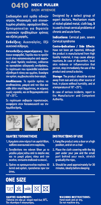 Μηχανισμός από επινικελωμένο μέταλλο, υφασμάτινη θήκη. Χρησιμοποιείται για θεραπεία αυχενικών προβλημάτων χρόνιας και οξείας μορφής.