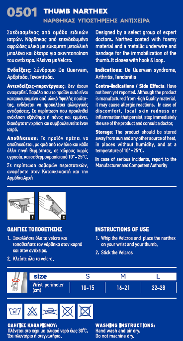 Νάρθηκας από επενδεδυμένο αφρώδες υλικό με πλαστική μπαλένα και δέστρα για ακινητοποίηση του αντίχειρα. Κλείνει με Velcro.