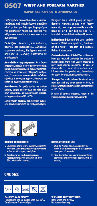 Νάρθηκας από επενδεδυμένο αφρώδες υλικό με δύο φαρδιές προσθαφαιρούμενες μεταλλικές λάμες και δέστρες για πλήρη ακινητοποίηση του καρπού και του αντιβραχίου.