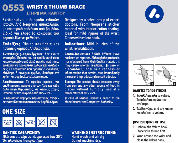 Από Neoprene αυτοκόλλητο με εσωτερική επένδυση από βαμβάκι. Ειδικό για ελαφριές κακώσεις του καρπού. Κλείνει με Velcro.