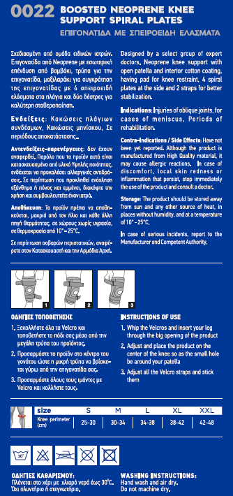 Επιγονατίδα από Neoprene με εσωτερική επένδυση από βαμβάκι, τρύπα για την επιγονατίδα, μαξιλαράκι για συγκράτηση της επιγονατίδας με 4 σπειροειδή ελάσματα στα πλάγια και δύο δέστρες για καλύτερη σταθεροποίηση.